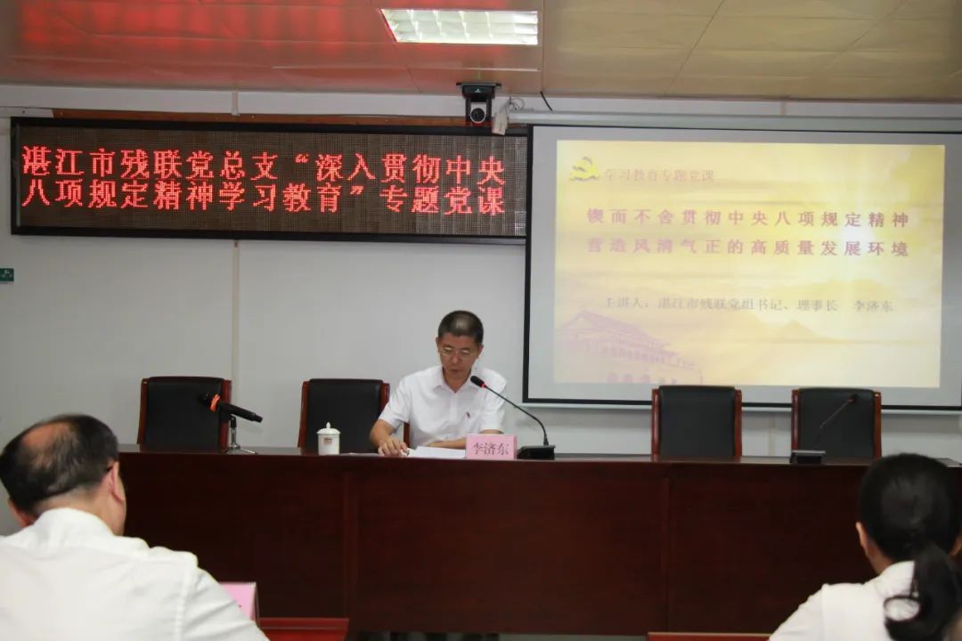 为扎实推进深入贯彻中央八项规定精神学习教育走深走实,6月19日上午,湛江市残联党组书记、理事长李济东以《锲而不舍贯彻中央八项规定精神营造风清气正的高质量发展环境》为题作专题党课报告,湛江市残联机关和直属单位全体党员干部、发展对象参加学习。