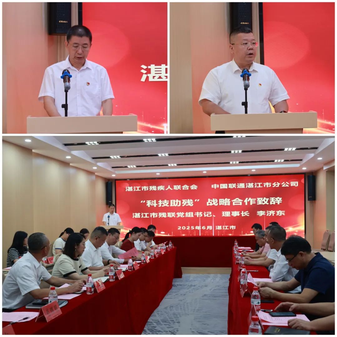 6月12日,湛江市残联与湛江联通“科技助残”战略合作签约仪式在经开区湛江联通大厦4楼展厅会议室成功举行,开启了双方以党建为引领、科技与关爱融合的战略合作新篇章。湛江市残联党组书记、理事长李济东,湛江联通党委书记、总经理钱大刚出席仪式并作讲话。